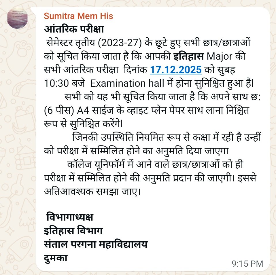 Date : 17.12.2025 Time : 12:30PM Place : Examination Hall